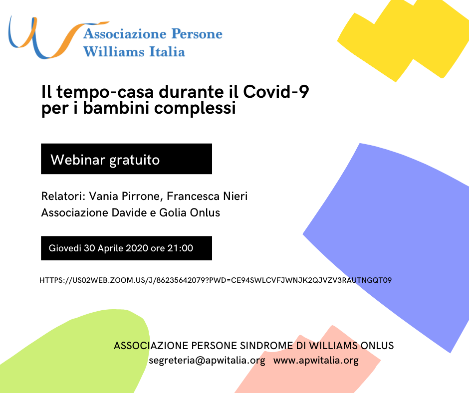 Le neuropsicomotriciste dell’Associazione Davide e Golia, che da anni seguono i bambini con Sindrome di Williams, si confronteranno con i genitori affrontando tematiche di supporto per superare la reclusione forzata dovuta al Covid-19.