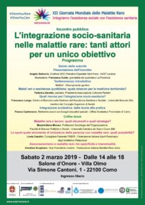 I genitori saranno impegnati invece la mattina in un incontro istituzionale co-organizzato dalla Federazione delle Malattie Rare Uniamo nell’ambito del progetto Vociferare: sono previsti interventi del responsabile del Centro di Coordinamento delle Malattie Rare Dottor Limongelli (da confermare); del Presidente del Forum Campano delle MR Dottor Orfeo Mazzella sulla situazione della presa in carico dei pazienti MR in Campania; di Giuseppe Silvano, Forum ed ex consigliere Uniamo, per quello che riguarda la presa in carico sociale delle persone con disabilità.